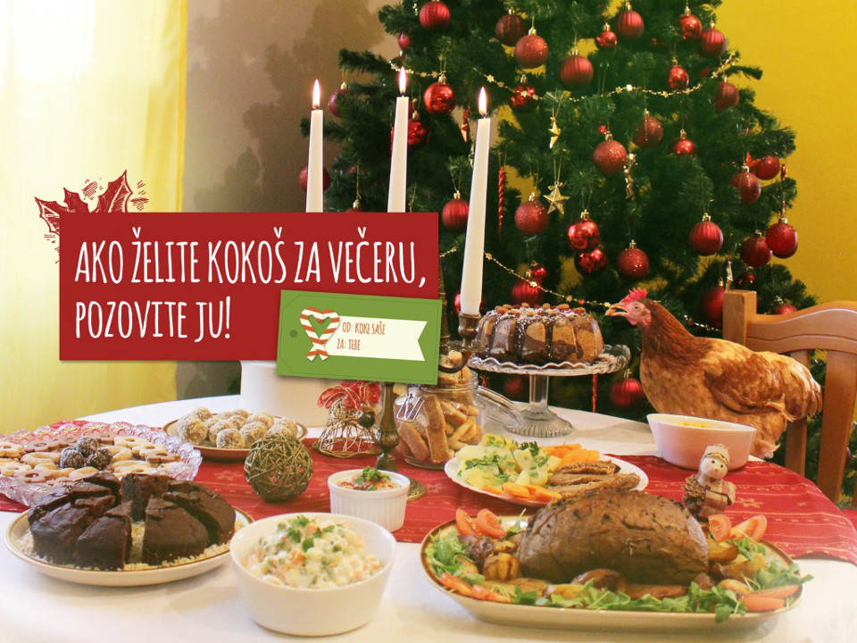 Kako bismo i drugim ljudima pokazali da su koke baš zakon i da postoji obilje blagdanske hrane koja se može jesti umjesto kokoši i ostalih životinja, odlučili smo objediniti te dvije ideje na plakatu. Saša je bila jako dobra na snimanju. Tijekom snimanja, koje je trajalo deset minuta, samo jednom prošetala se preko stola i veganskih kolača, a svoj kukuruz nije niti pogledala. Kuglof joj se najviše svidio zbog badema pa je jedan odmah prisvojila. No morali smo ga zdrobiti da ga proba.